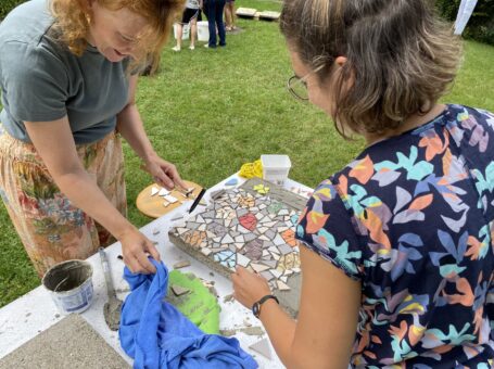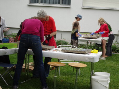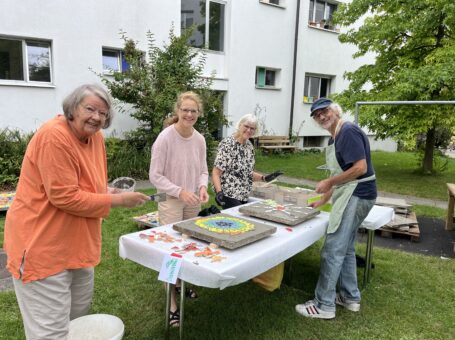 Der Aktionstag des Projekts "Mosaik im Bärentatzenhof" konnte planmässig und bei besten Bedingungen stattfinden. Unter der Anleitung von Christian Dürrenberger & Mirjam Candan entstanden äusserst kreative und farbenfrohe Mosaik-Trittsteine. Die zahlreichen Kinder und Erwachsene hämmerten, klebten und gestalteten, was das Zeug hielt.